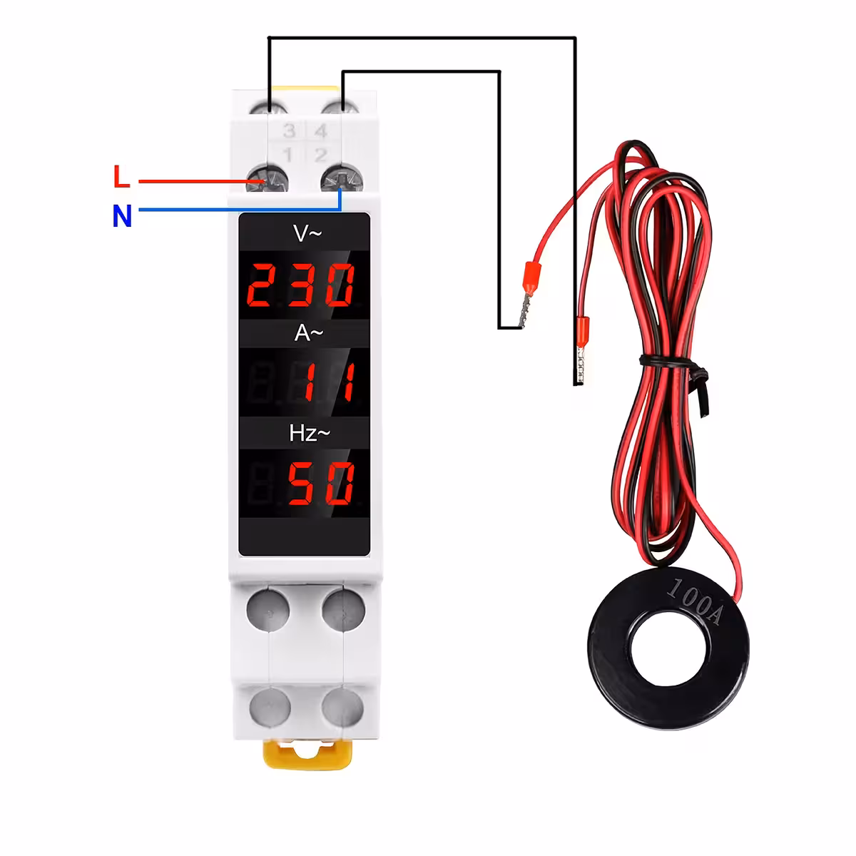 Amperímetro Digital Trifásico para Panel Eléctrico – Medición de Corriente 1-100A, Montaje en Riel DIN