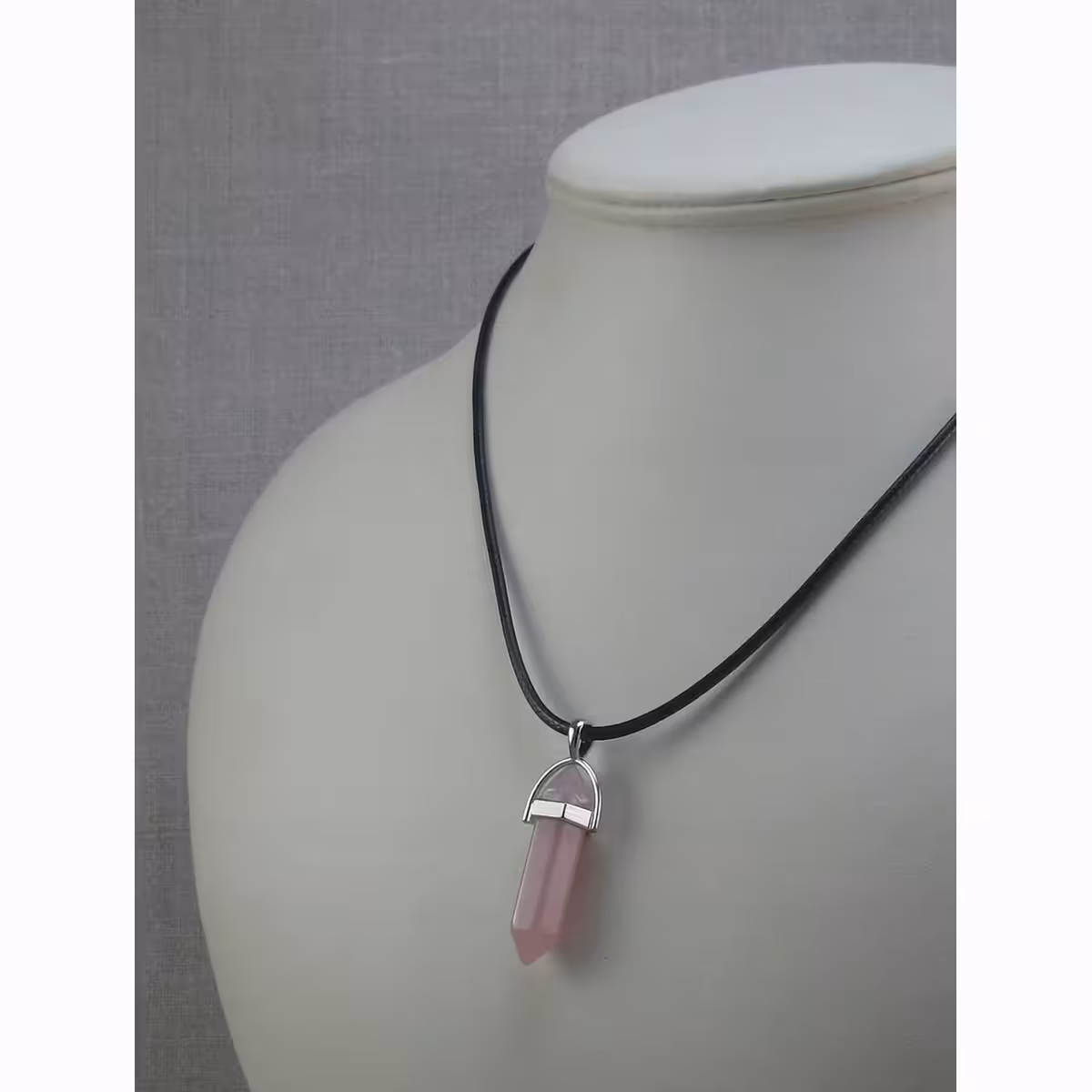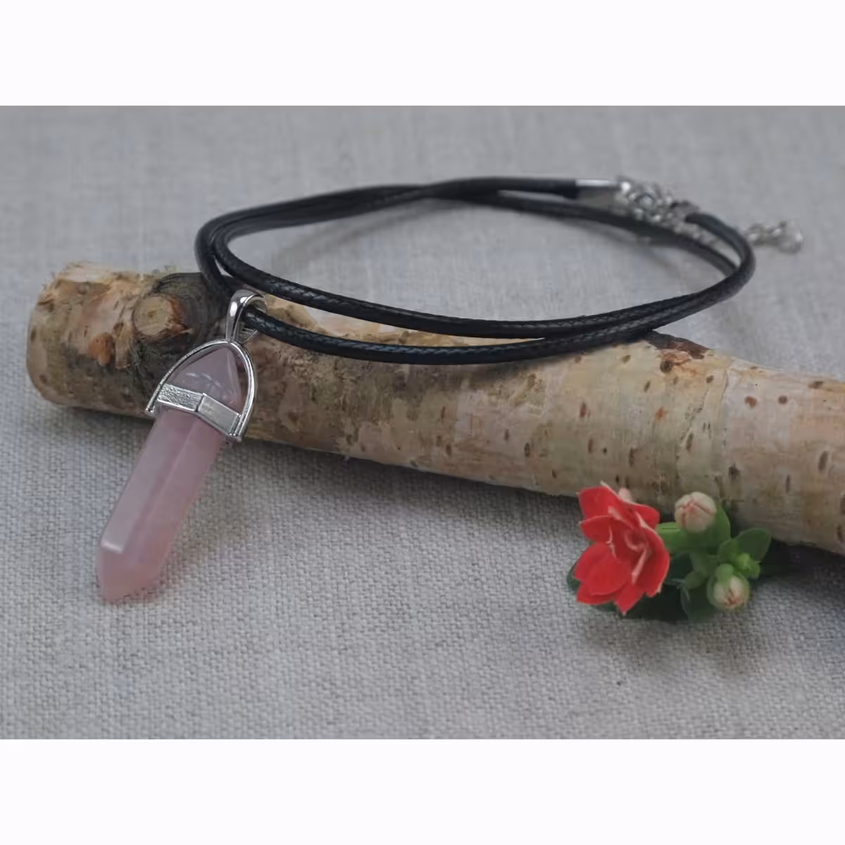 La oferta incluye: colgante de cuarzo rosa y cadena de cuero, elegante y resistente, con cierre tipo mosquetón.