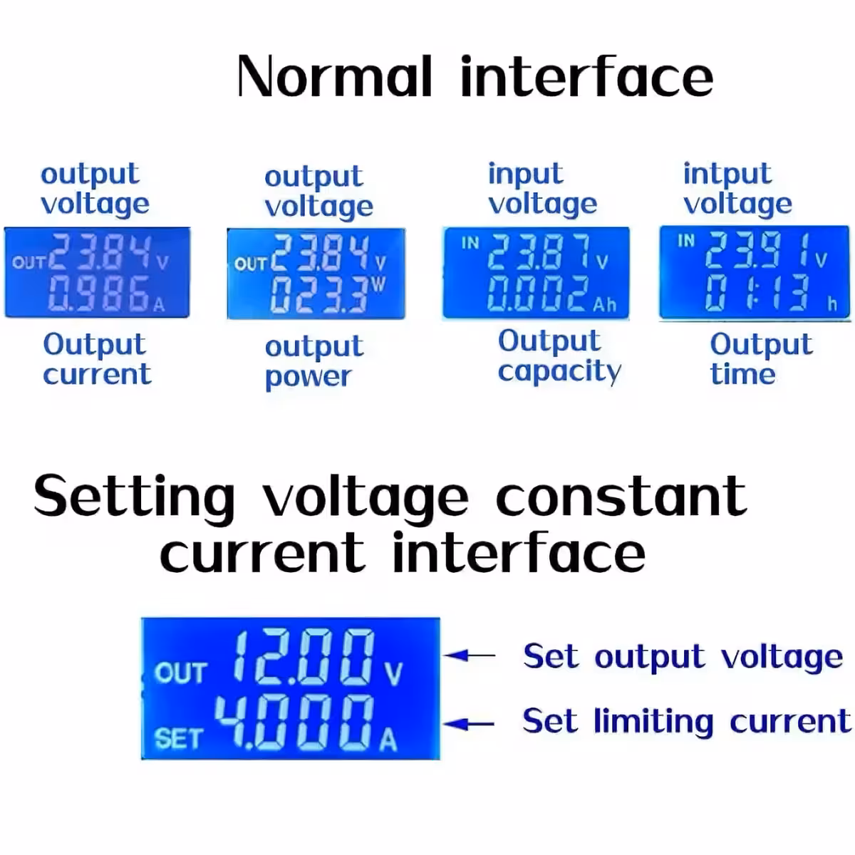 - Calibración de voltaje y corriente: Pulse U/I para acceder a la interfaz de calibración (CAL). Aquí puede calibrar con precisión el voltaje de entrada, salida y corriente para obtener resultados óptimos y mayor exactitud.