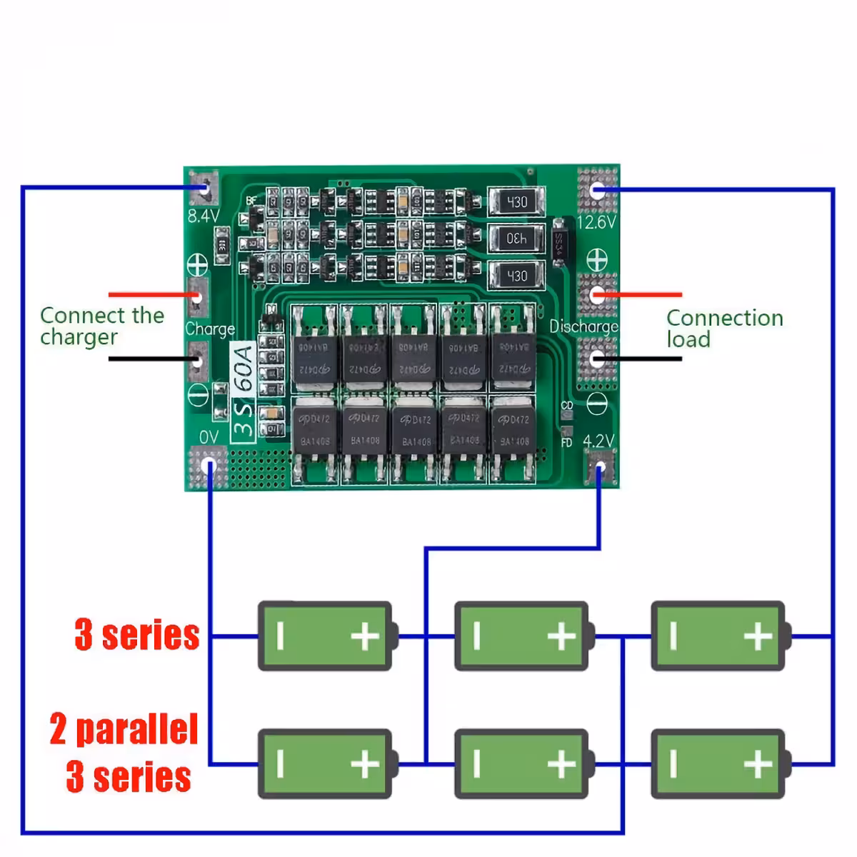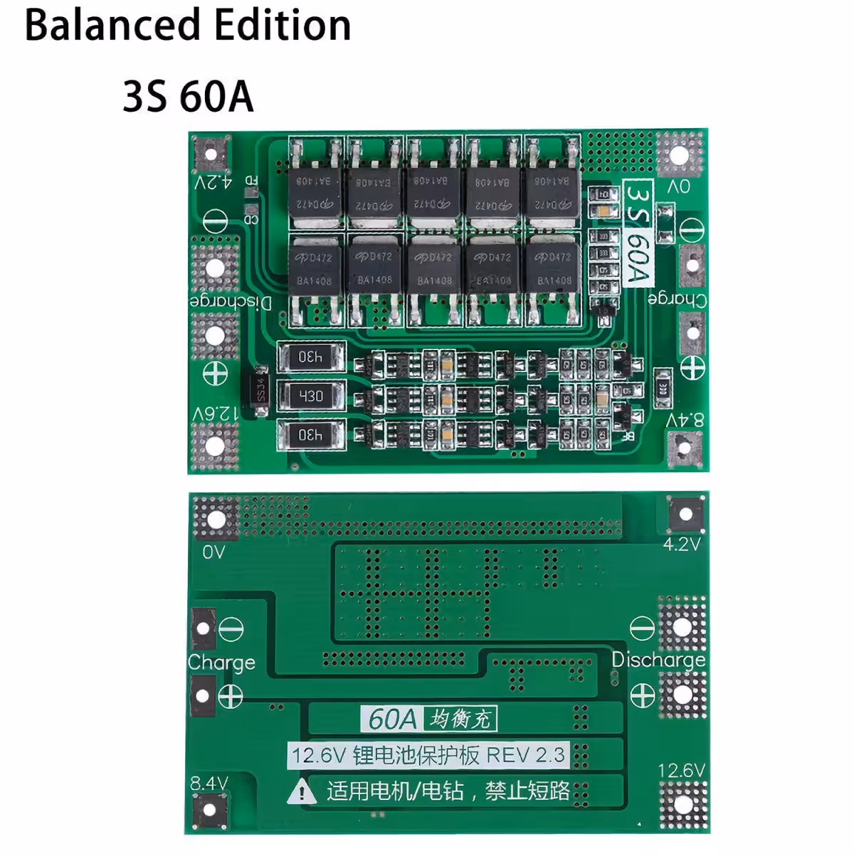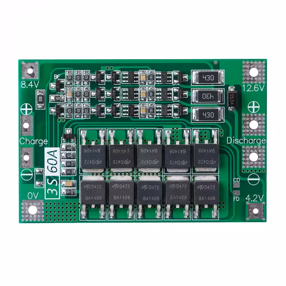 El módulo BMS 3S 60A ofrece protección completa para baterías Li-Ion 18650 de 14,8V (3S), siendo ideal para aplicaciones como taladros, destornilladores eléctricos, drones, coches RC, aspiradoras robotizadas y otros dispositivos portátiles de potencia.