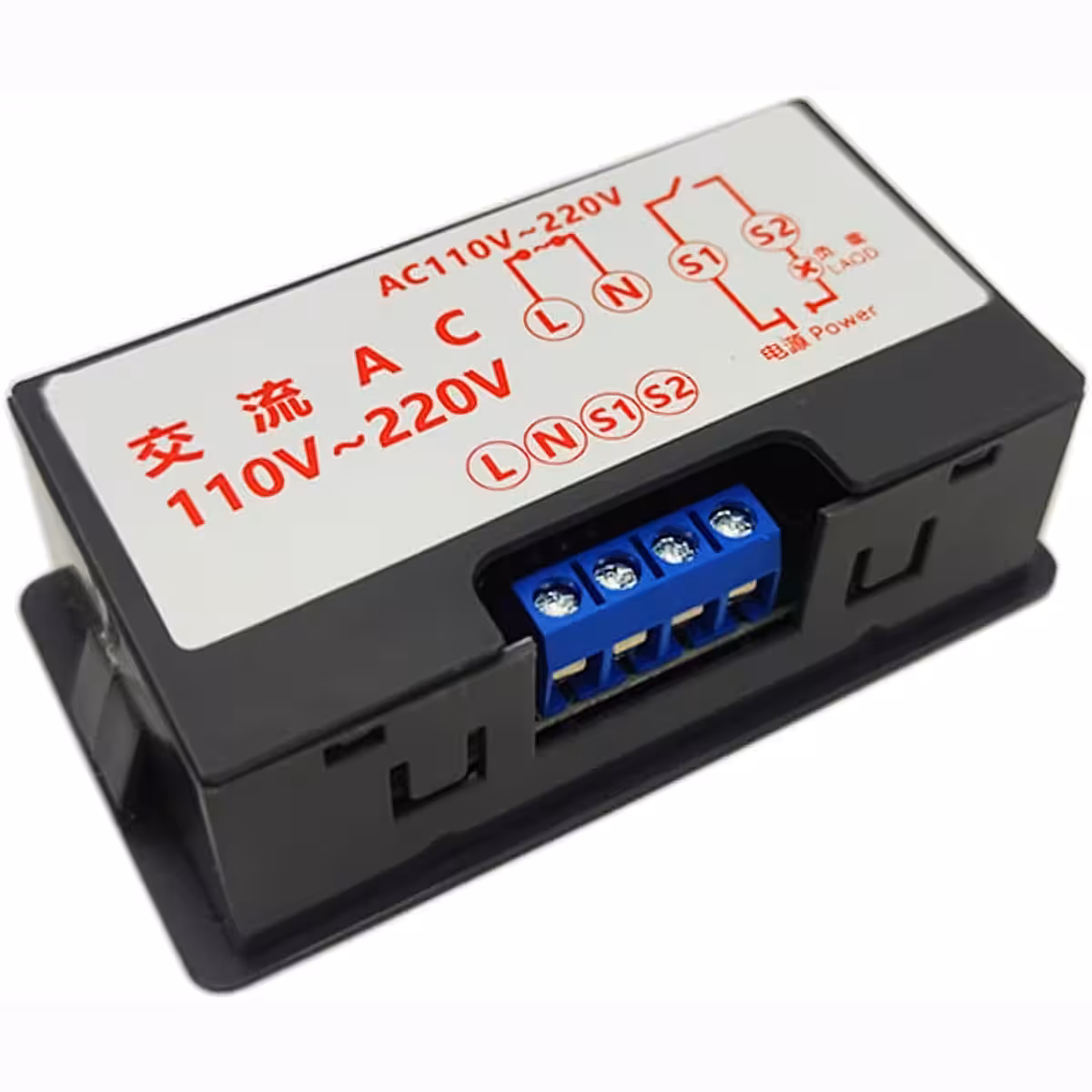 Relé de tiempo programable con temporizador digital y pantalla LED doble, ideal para automatización y control preciso de intervalos de tiempo en aplicaciones eléctricas de 220V.