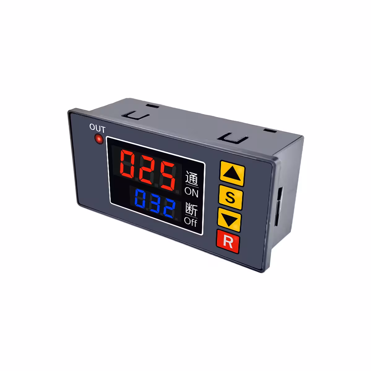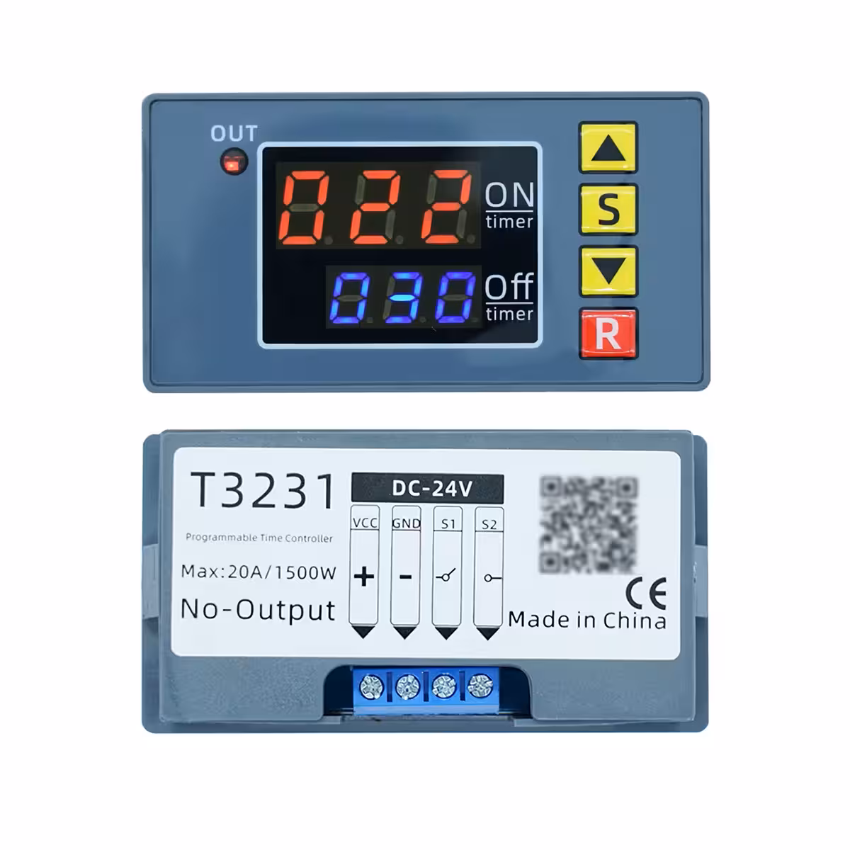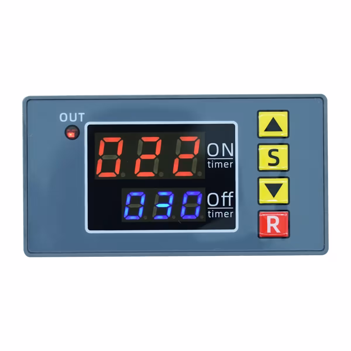 Este relé temporizador cíclico 24V DC es un temporizador programable multifuncional, ideal para el control automático de equipos eléctricos como bombas, ventiladores, luces LED, calentadores o sistemas de riego.