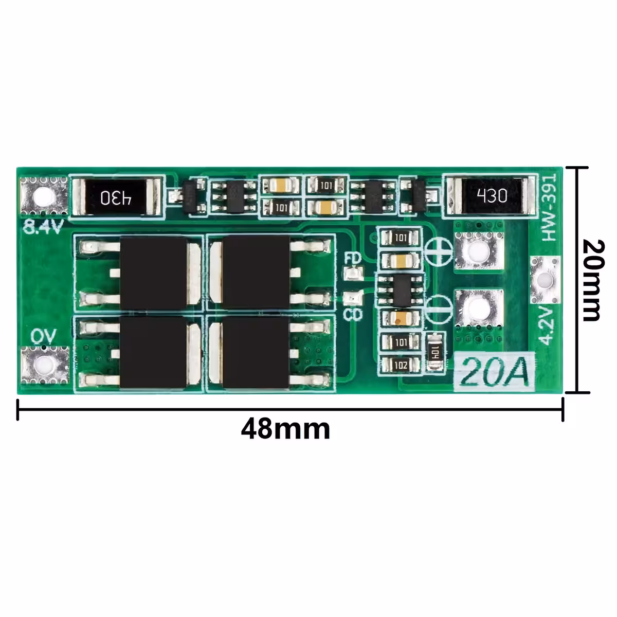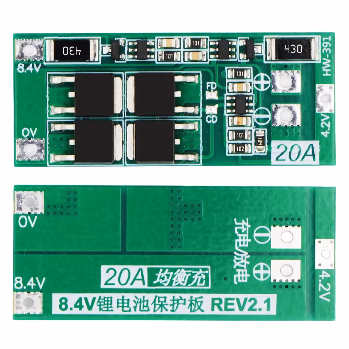 Set de 2 piezas × BMS 2S 20A — Versión con balance (48×20×3.4mm), ideal para paquetes Li-Ion 7.4V con protección avanzada y balanceo.