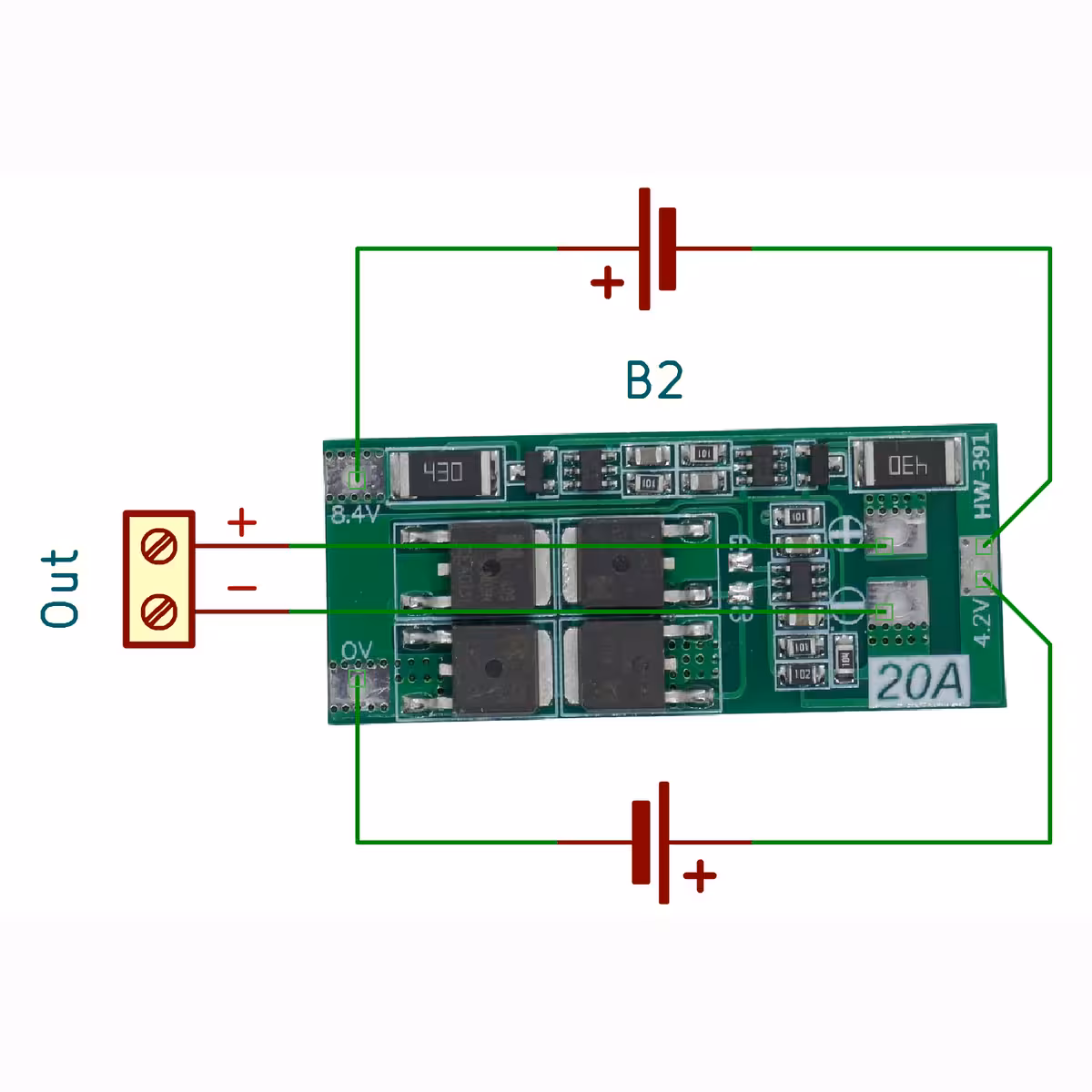Cableado sencillo — puntos claros para conexión: 0V, 4.2V, 8.4V y terminales de salida +/−.