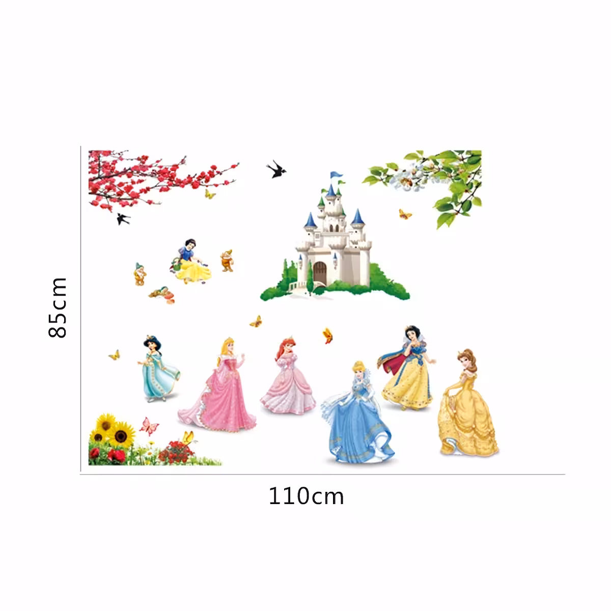 Este set de pegatinas de pared incluye imágenes de las famosas princesas Blancanieves, Ariel, Aurora, Cenicienta, Jasmine, Pocahontas y Rapunzel, aportando un ambiente alegre y colorido a cualquier habitación infantil.